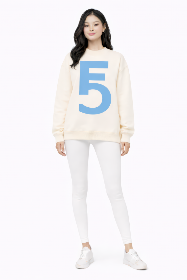 A cream fleece crewneck featuring the Fem Cartel “10 Within” symbol printed in sky blue ink, representing the belief that every woman already carries the power of a ten within herself.