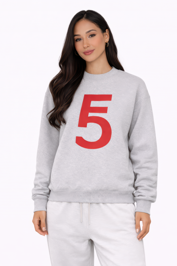 A heather gray fleece crewneck featuring the Fem Cartel “10 Within” symbol printed in red ink, representing the belief that every woman already carries the power of a ten within herself.